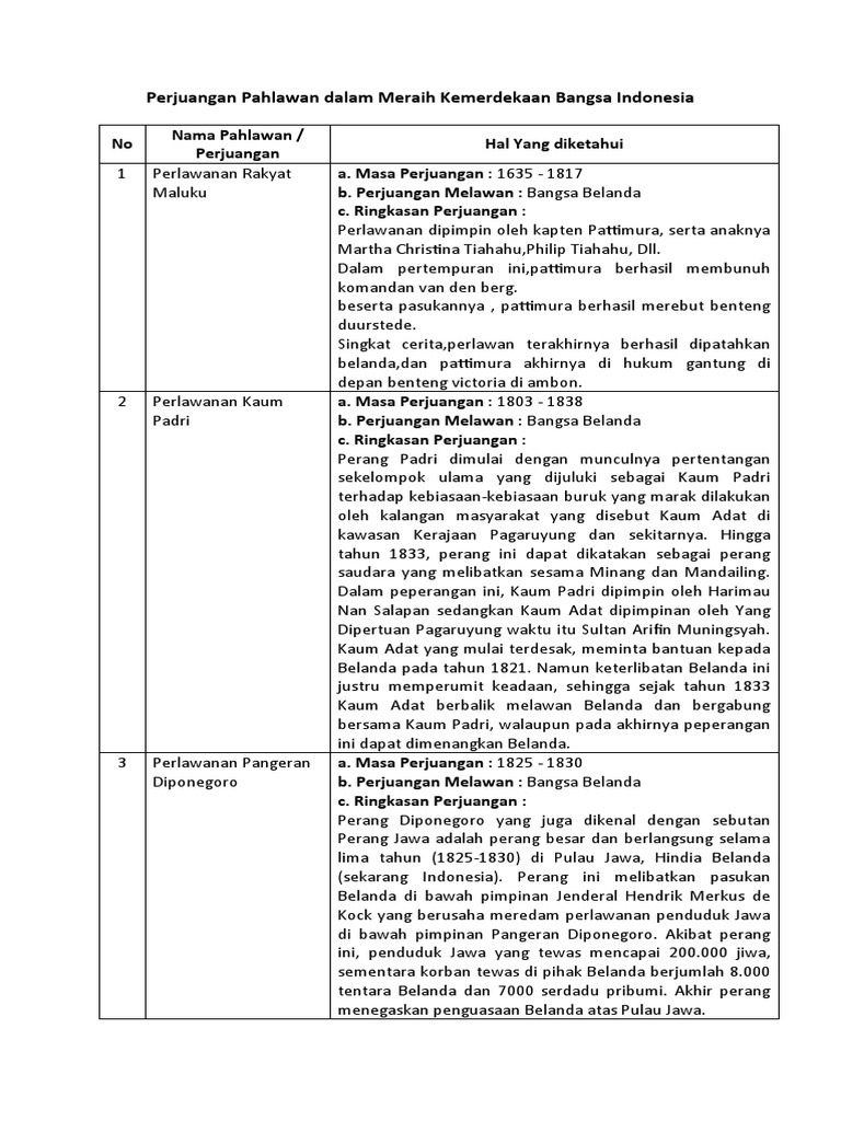 Perjuangan pahlawan dalam meraih kemerdekaan bangsa indonesia. Informasi yang diminta pun meliputi Perlawanan Rakyat Maluku Perlawanan Kaum Padri Perlawanan Pangeran. Perlawanan Rakyat Maluku AMasa perjuangan. Perang Aceh di bawah pimpinan pahlawan nasional Cut Nyak Dhien dan Teuku Umar juga merupakan bukti perjuangan rakyat Indonesia untuk meraih kemerdekaan dan mengusir penjajah dari wilayahnya.